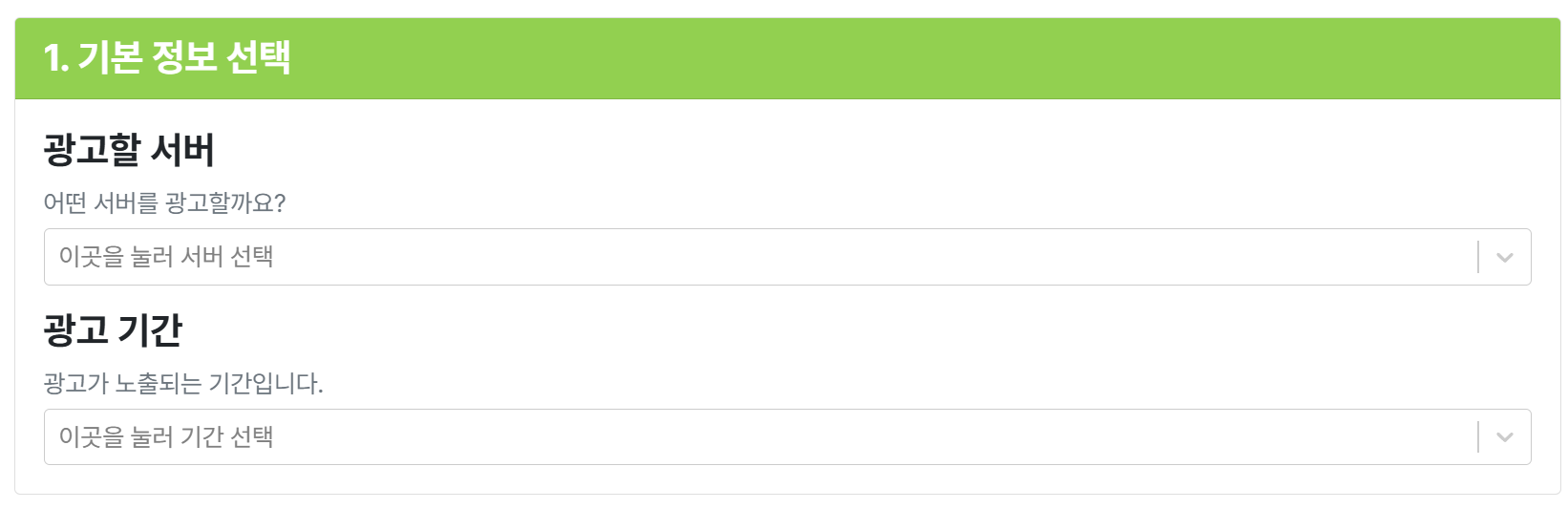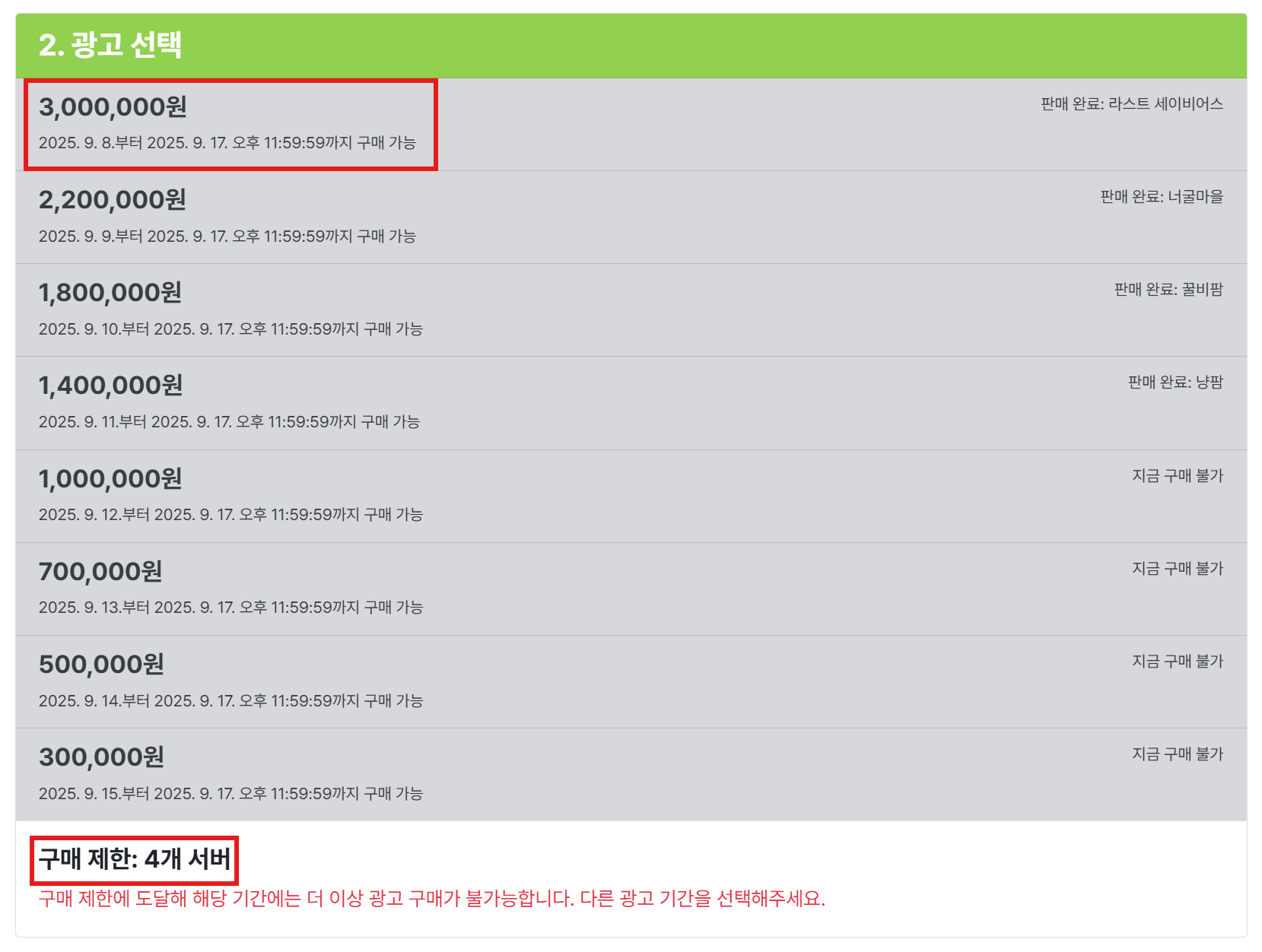 광고할 서버와 광고 기간을 누르면 해당 기간의 광고 구좌가 표시됩니다.
